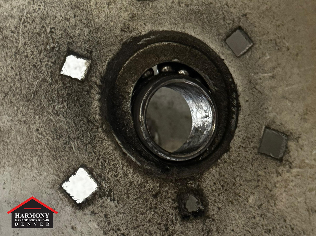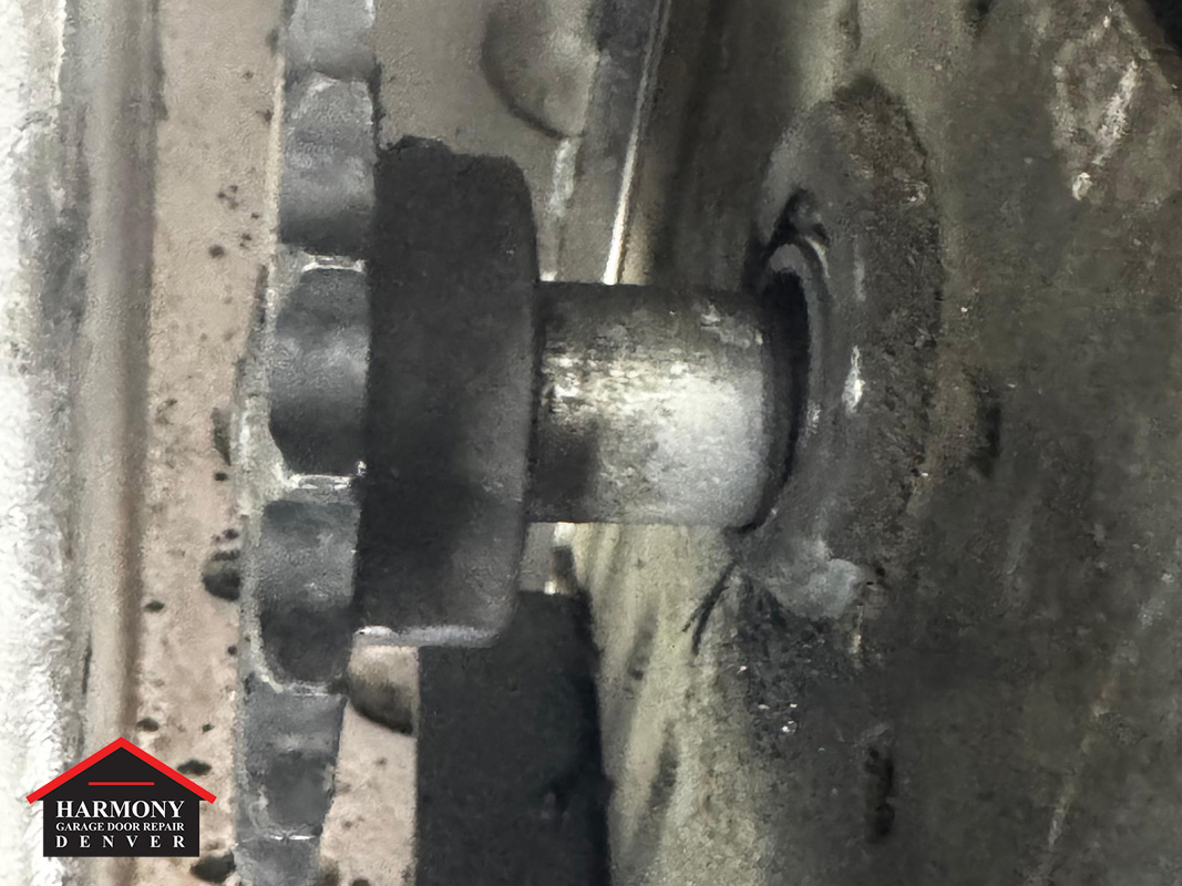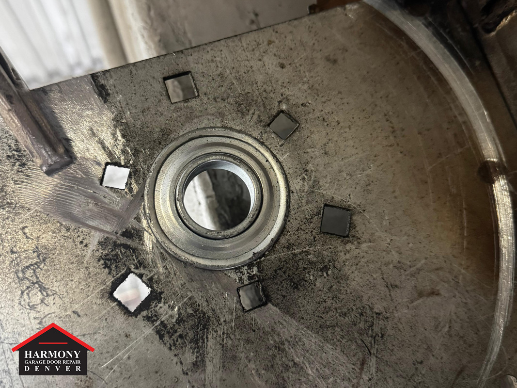 This Denver commercial door had a loose bearing in the end plate. On a high-lift setup, the shaft and spring system carry serious load, so when a bearing loosens, the shaft can shift and lose its true alignment.