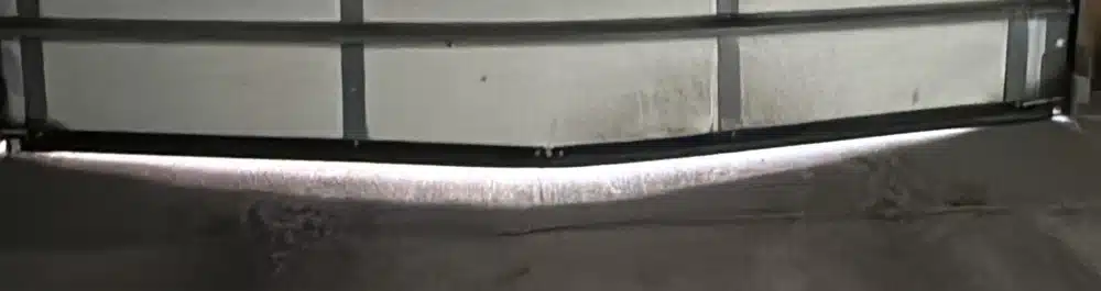 Door looks uneven or bent. Damaged panels can affect alignment and operation.