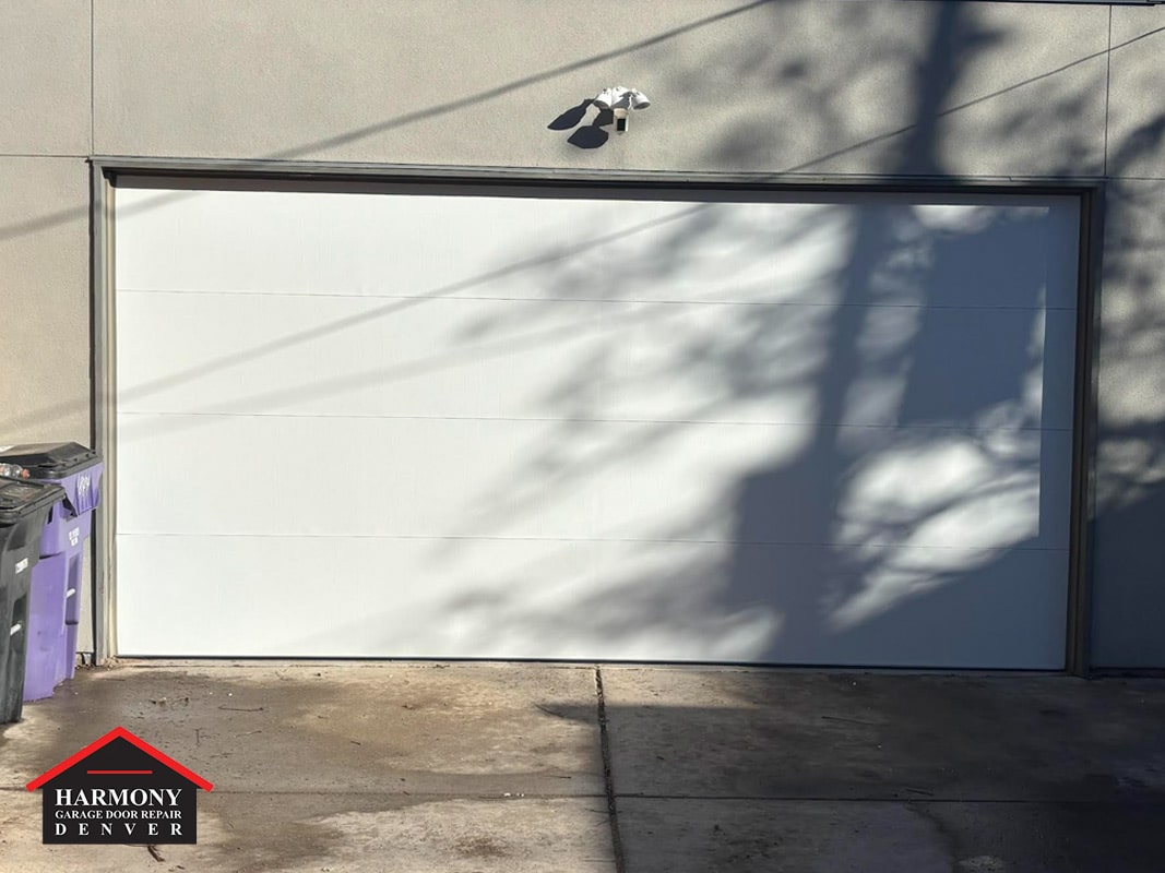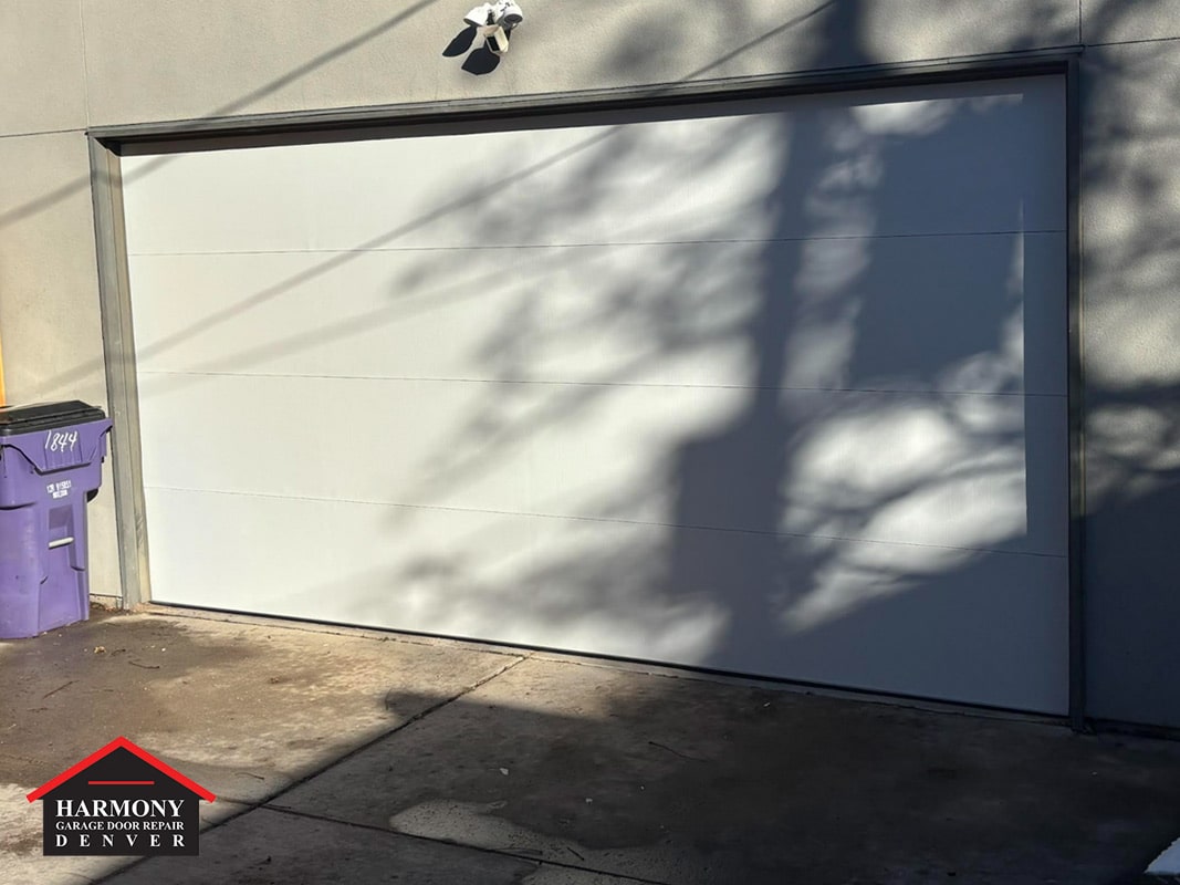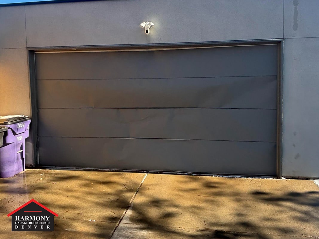 A vehicle backed into this garage door in Highland, Denver, leaving the door damaged and unsafe to run. Impact damage like this can bend sections, twist the track alignment, and put extra strain on rollers, hinges, and the opener. For this project, Harmony Garage Door Repair Denver completed a full replacement to restore safe operation, smooth travel, and a clean seal at the floor.